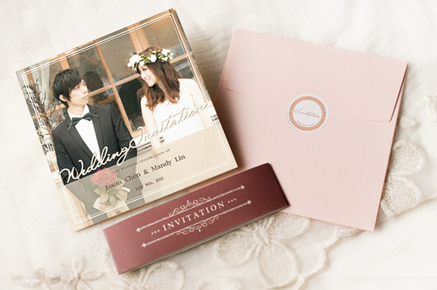 卡片採用色彩表現佳的進口美術卡紙,搭配帶有微微光感的腰帶,讓婚卡更添幸福感。